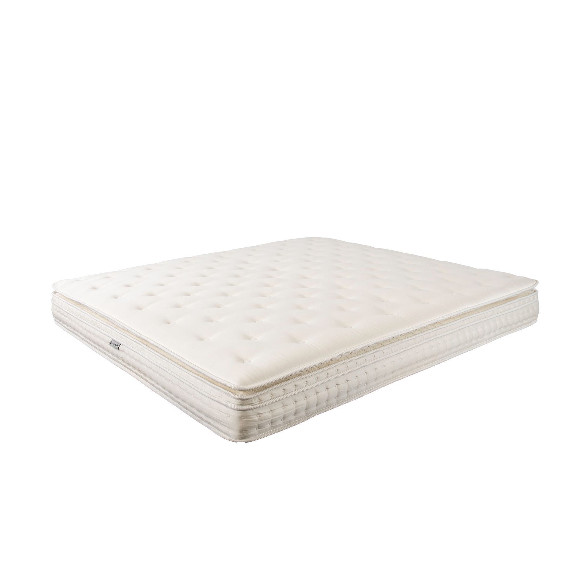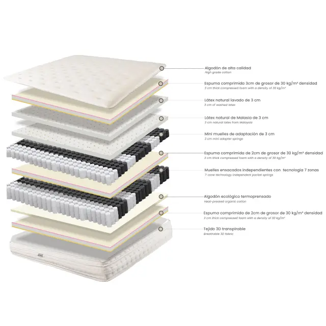 Večplastna hibridna vzmetnica z dvojno plastjo naravnega lateksa in dvojnim sistemom neodvisnih žepkastih vzmeti s 7 conami, ki zagotavlja odlično prilagodljivost in optimalno neodvisnost počitka. Njena zračna bombažna tkanina in plasti visokogostotne pene spodbujajo prezračevanje ter zagotavljajo bolj udoben in ergonomski počitek.