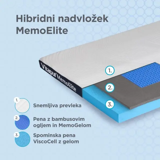 Hibridni nadvložek Vitapur MemoElite z višino 8 cm je popolna rešitev za izboljšanje udobja na tvojem starem ležišču, kavču, na potovanju ali kampiranju. Inovativni material MemoGel se takoj odzove na premik tvojega telesa in nudi do 25 % boljšo podporo kot običajna spominska pena. S svojo mrežasto strukturo učinkovito odvaja odvečno toploto stran od telesa, kar zagotavlja kar 50 % boljšo zračnost nadvložka. Sveže in suho spalno okolje omogoča tudi gel v spominski peni ViscoCell, ki absorbira toploto in uravnava temperaturo, da se med spanjem ne potiš. Spominska pena nudi prilagojeno podporo v vseh spalnih položajih, razbremeni pritisk in ohranja tvojo hrbtenico v optimalnem položaju za spanec brez bolečin. Nadvložek vsebuje tudi bambusovo oglje, ki deluje protibakterijsko in zagotavlja, da spalna površina ostane čista in higienična. Za udoben, svež in zdrav spanec je nadvložek MemoElite prava izbira!