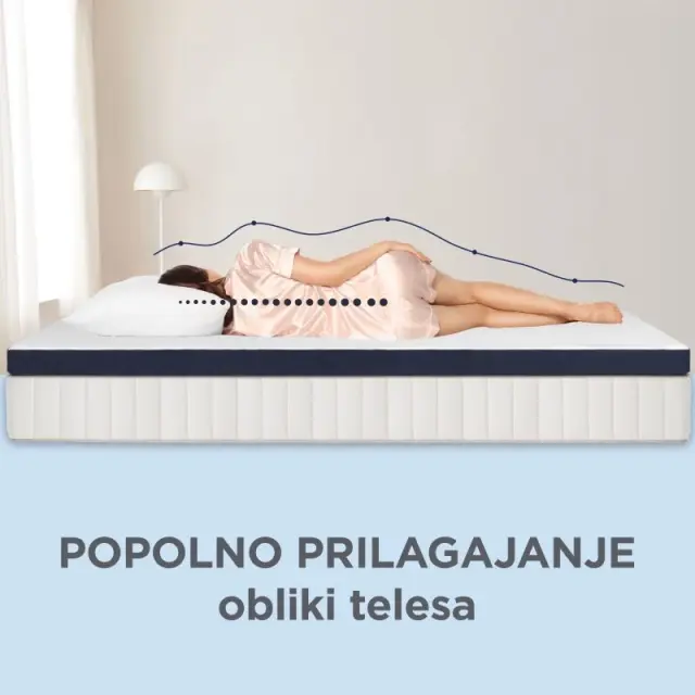 - Spominska pena ViscoCell se prilagaja obliki telesa.: Mehka spominska pena se med spanjem ves čas odziva na premike telesa in se mu prilagaja, zato je udobje v vseh spalnih položajih zagotovljeno. Tvoja hrbtenica je vedno pravilno poravnana, hkrati pa pena tudi razbremeni pritisk telesa na površino nadvložka. Jutranje bolečine bodo tako pozabljene.