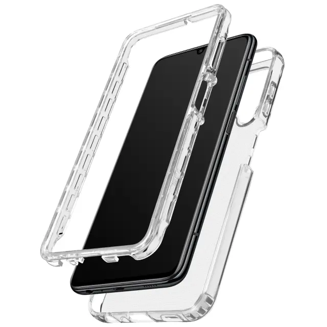 Zaščitni ovitek posebej oblikovan za Samsung Galaxy A22. Dvodelna zasnova ovije vsa občutljiva področja telefona: hrbet, zaslon, kamero itd. Silikonski zadnji pokrov in sprednji pokrov iz trdega polikarbonata, ki dvigne zaslon. Blok zadnje kamere je dvignjen, da ne moti.
