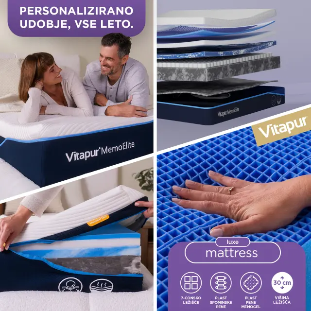 Doživi revolucijo spanja z našim hibridnim ležiščem MemoElite, razvito v sodelovanju z vrhunskimi strokovnjaki za spanje in zasnovano, da zadovolji tudi najzahtevnejše spalne potrebe. Srce ležišča je inovativni MemoGel, material, ki je do 50 % bolj zračen in nudi do 25 % večjo podporo kot običajna spominska pena. MemoGel se nemudoma prilagodi vsakemu premiku tvojega telesa in ga razbremeni, zato imaš pri ležanju na njem občutek, da lebdiš. Udobje MemoGela dopolnjujeta spominska pena MemoryAdapt, ki popolnoma objame tvoje telo, in zračna pena AirFeel, ki aktivno uravnava temperaturo, da bo tvoj spanec vedno svež in prijeten. Preizkušeno z več kot 30 testi in brez škodljivih snovi, kot je formaldehid, MemoElite zagotavlja popolnoma varen in zdrav spalni prostor zate in za tvojo družino. Investiraj v svoj spanec, zdravje in vsakodnevno počutje ter občuti razliko prav vsako jutro.