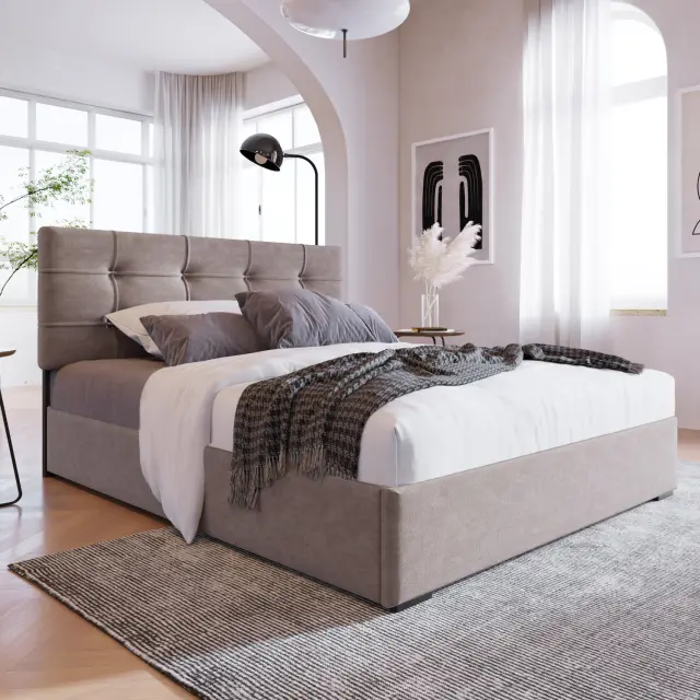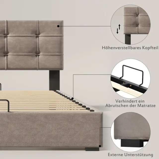 Hidravlična enojna oblazinjena postelja 90x200 cm, nastavljivo vzglavje, žamet, sodoben posteljni okvir s shrambo, svetlo siva.