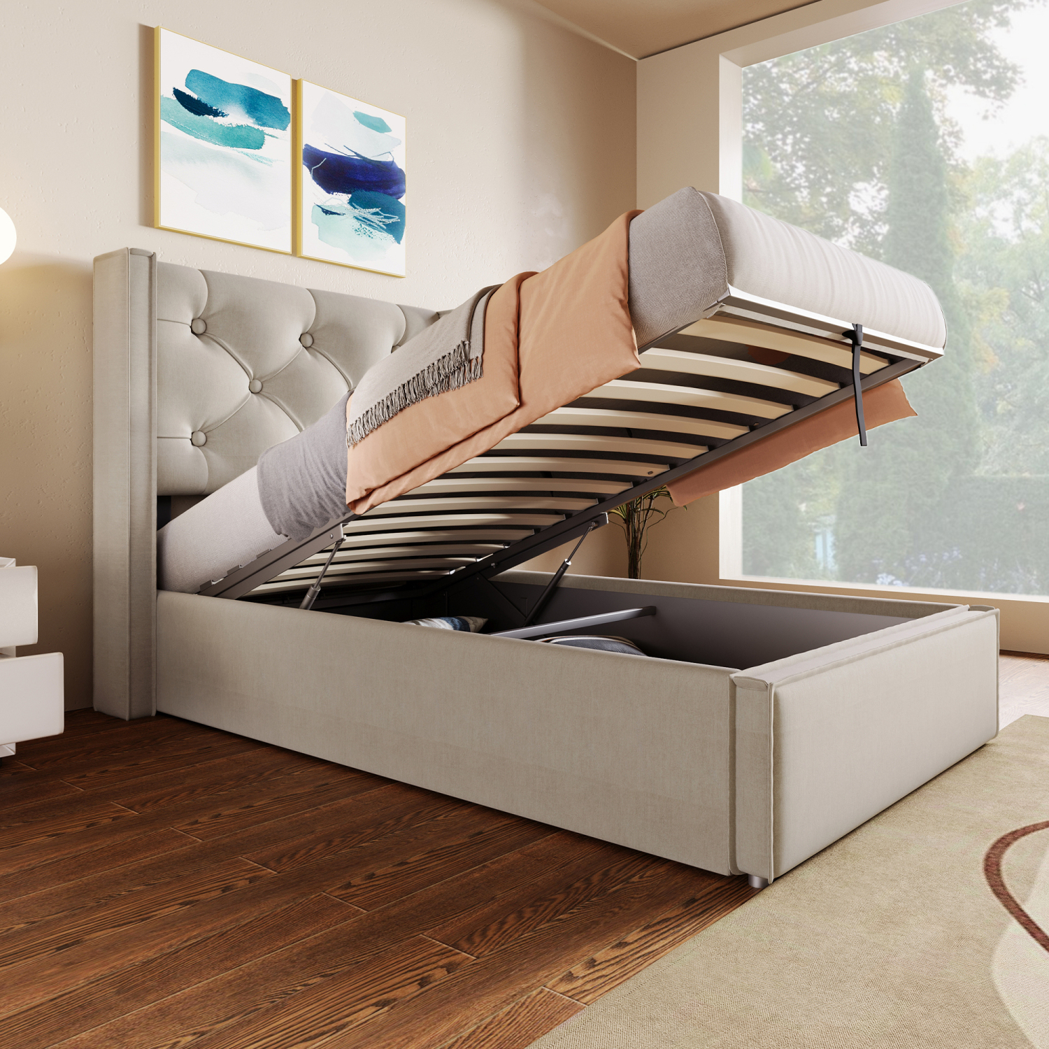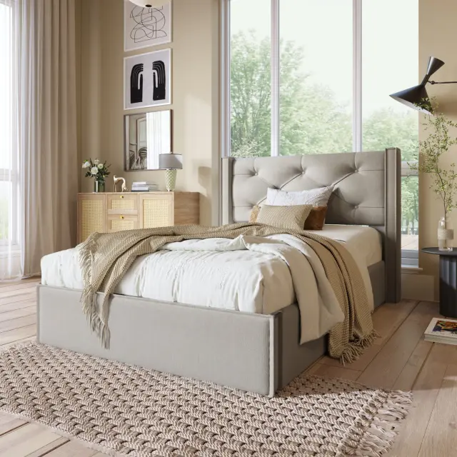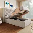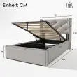 Hidravlična enojna oblazinjena postelja 90x200 cm, kovinski okvir, letveno dno, shranjevalni prostor, bombaž, svetlo siva.