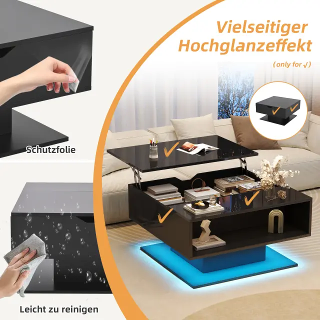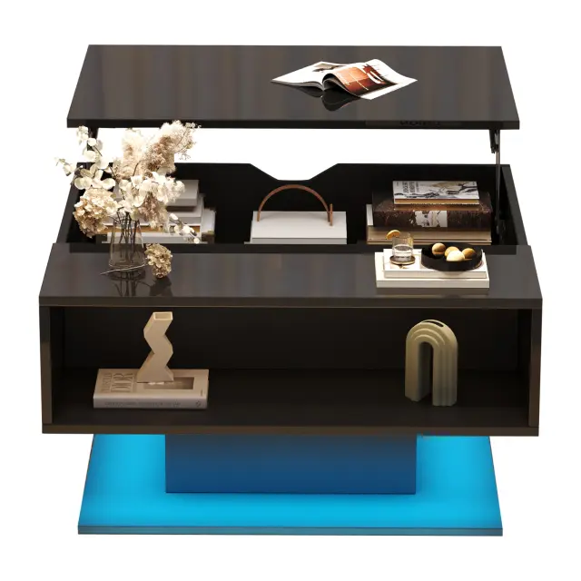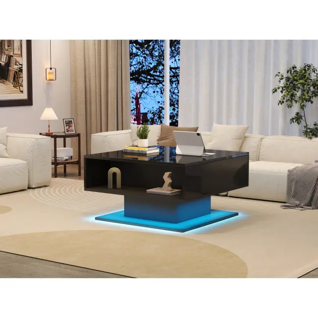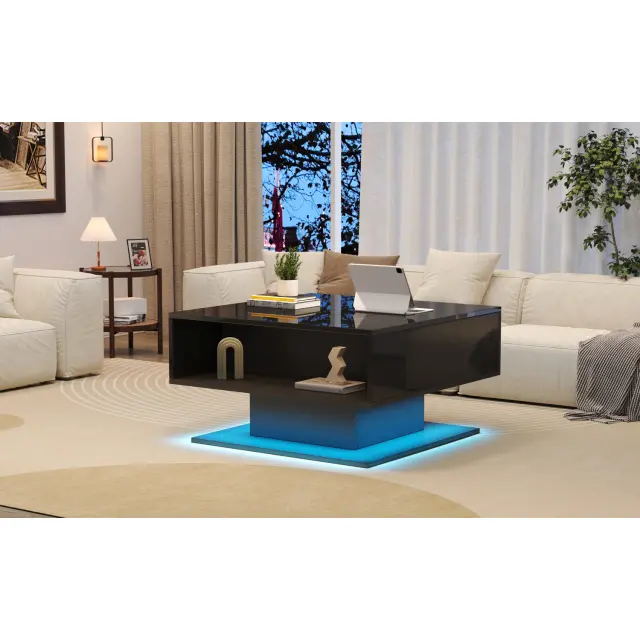 Ta klubska mizica z dvižnim mehanizmom (80 x 77 x 40 cm) ima skriti predal, LED luči, ki jih je mogoče upravljati prek aplikacije, in visokosijajno površino.