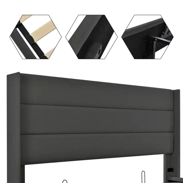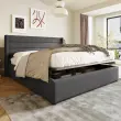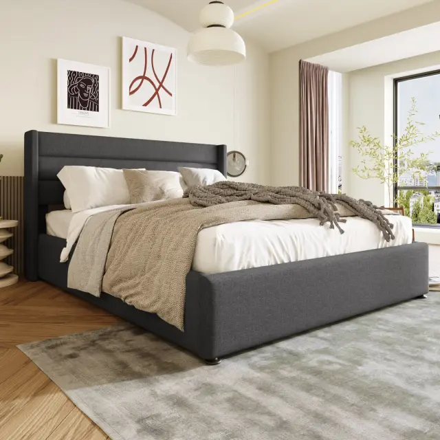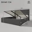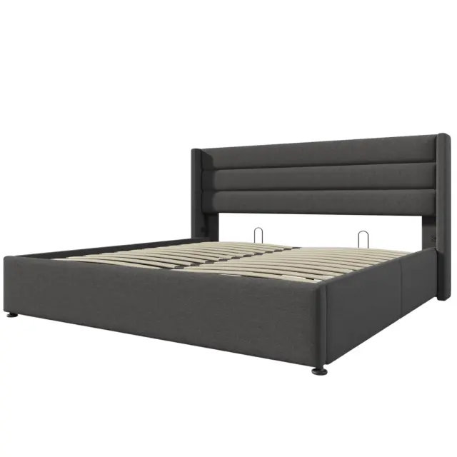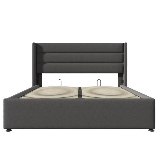 Hidravlična postelja s shranjevalnim prostorom 140x200cm, laneno siva z lesenim letvenim ogrodjem in kovinskim okvirjem.