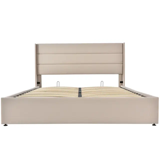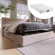 Hidravlična postelja s shranjevalnim prostorom 140x200 cm z vzmetnico, letveni okvir, lanena bež barva.