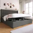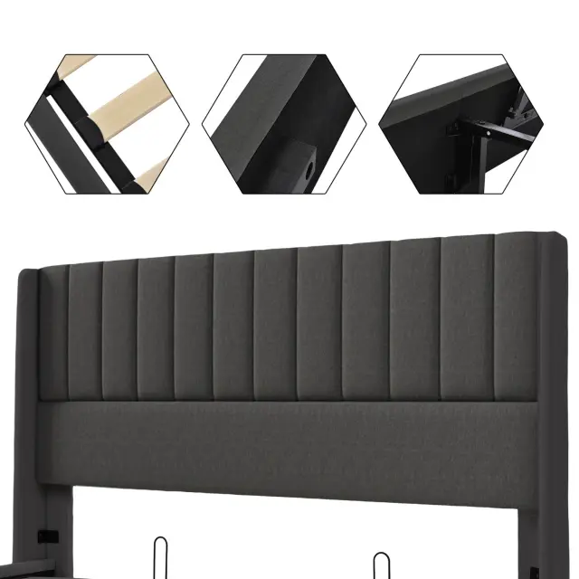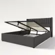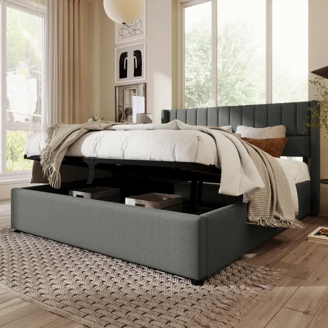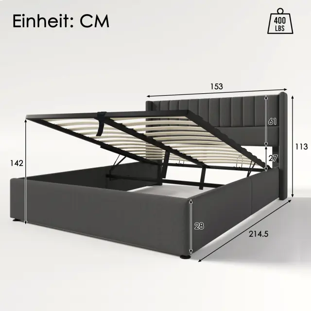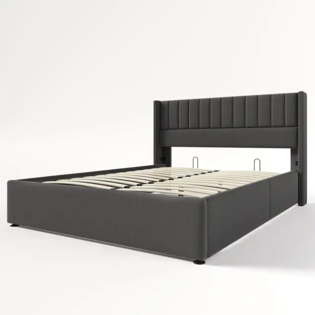 Hidravlična postelja s shranjevalnim prostorom 140x200 cm, laneno siva, lesen letveni okvir, kovinski okvir.