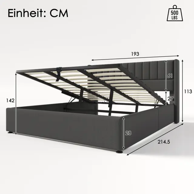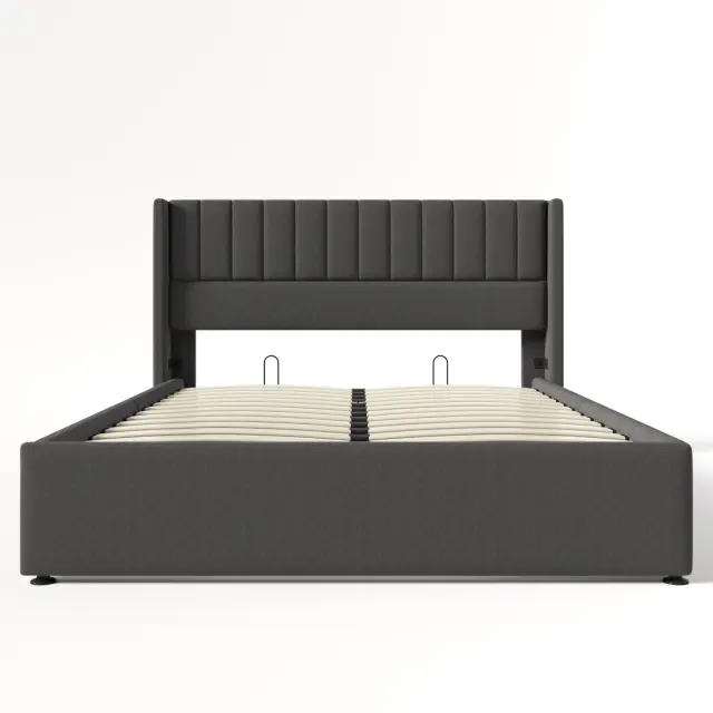 Hidravlična postelja s shranjevalnim prostorom 180x200 cm, laneno siva, kovinski okvir z letvenim podnožjem.