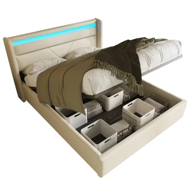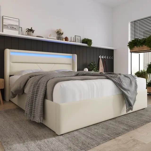 Hidravlična postelja s shranjevalnim prostorom in LED svetlobnim trakom, bel okvir za zakonsko posteljo (140x200cm)