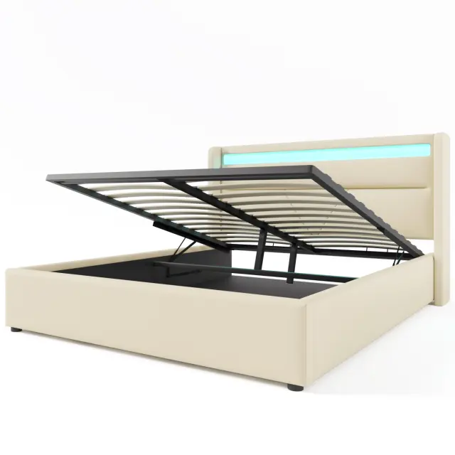 Hidravlična postelja z odlagalnim prostorom in LED svetlobnim trakom, oblazinjen dvojni okvir postelje 160x200cm, bela (daljinski upravljalnik)