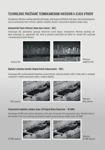 Samodejni nadzor občutljivosti (AGC) : tehnologija AGC samodejno prilagodi dinamični razpon slike. Hikvision toplotne slike uporabljajo edinstveno tehnologijo, imenovano adaptivni AGC, ki je veliko naprednejša od običajnih tako imenovanih linearnih AGC, ki se uporabljajo v toplotnih kamer drugih proizvajalcev.
