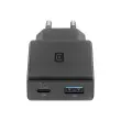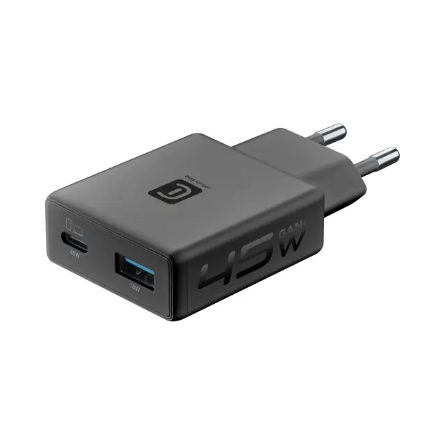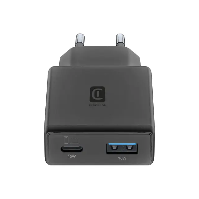Izjemno tanek 45W GaN polnilnik Cellularline Slim. Dvojna vrata (USB-C in USB-A) za hitro polnjenje prenosnikov in telefonov. Popolna rešitev za ozke prostore in potovanja.