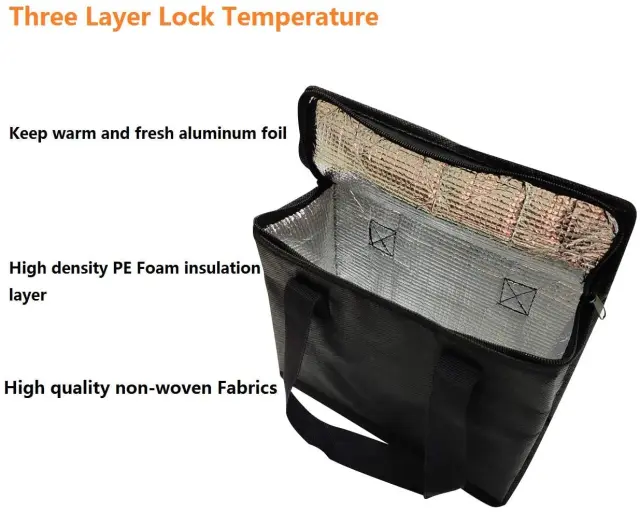 Varna in zanesljiva uporaba: Z izolirano notranjostjo in ročajem, ki gre od spodaj navzgor skupaj z močno in stabilno zadrgo, ste lahko varni in varni, da lahko vrečka drži tako težjo embalažo, ki dolgo časa ohranja temperaturo vaših živilskih izdelkov. .