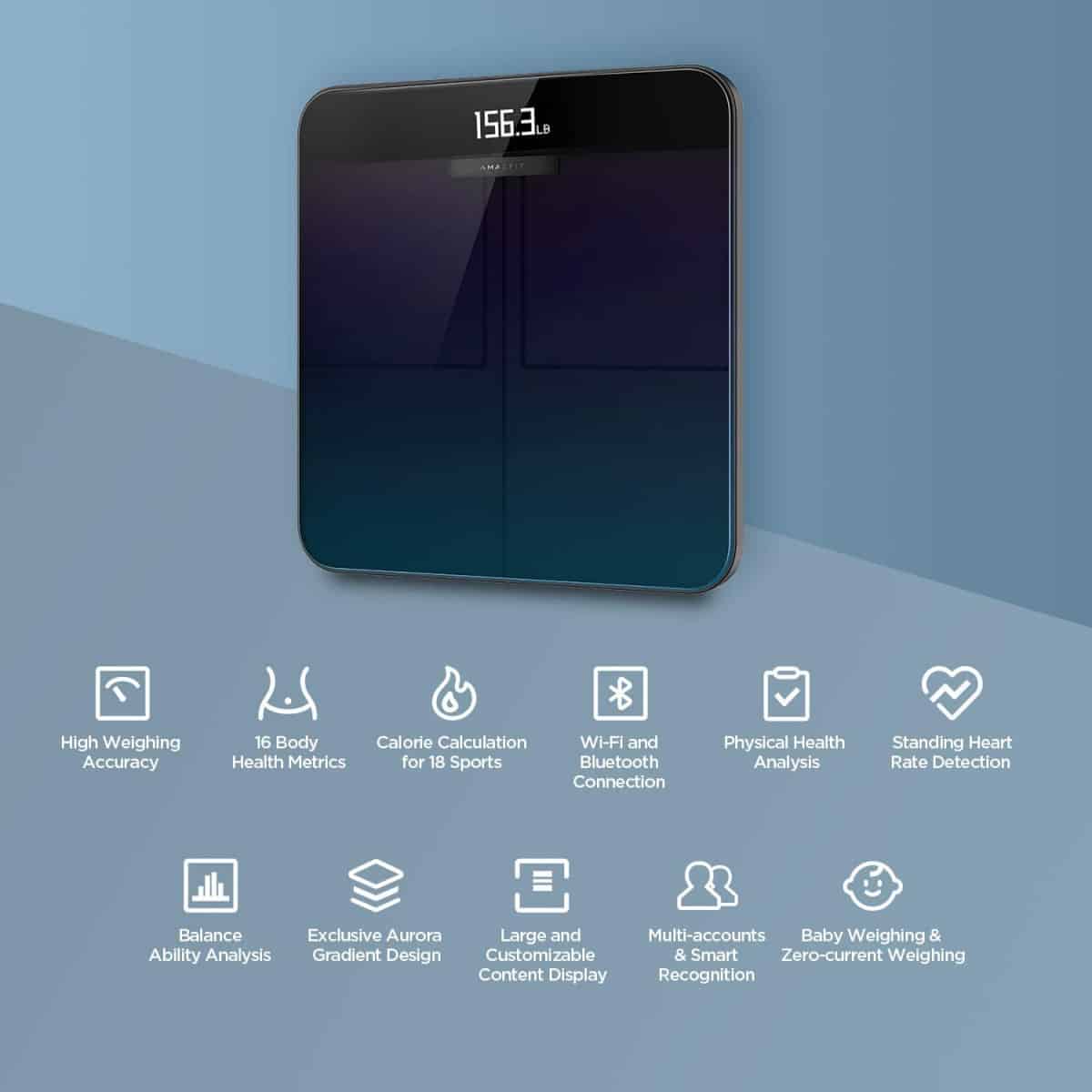 Spoznajte pametno tehtnico Amazfit, ki prikazuje kar 16 različnih podatkov o vašem telesu. Za povezovanje skrbi Wi-Fi in Bluetooth tehnologija. Vgrajen senzor v obliki črke G bo zaznal vse spremembe teže večje od 50g. Tako bo zaznal spremembo tudi če boste spili le en kozarec vode.