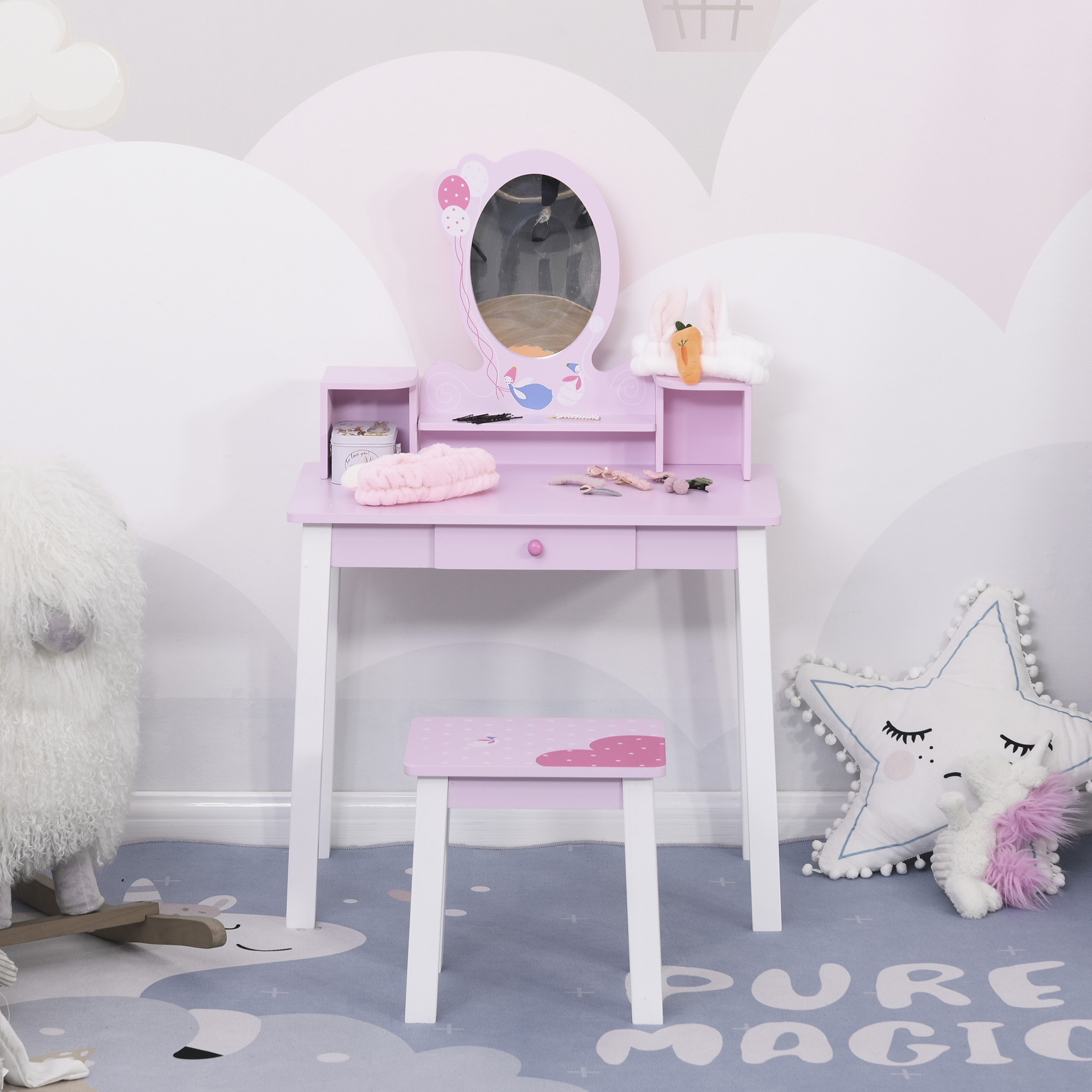 ZABAVNA IN BARVITA: Bela in roza konstrukcija je okrašena s pisanimi viličkami in je kot nalašč za opremo otroške sobe ali igralnice. POPOLN KOMPLET: Toaletna miza ima stolček, predal, police in snemljivo ogledalo. CERTIFICIRANO LES IN MATERIALI: Toaletna miza je izdelana iz trpežnega MDF-a in visokokakovostnega borovega lesa. Vsi deli imajo zaobljene in polirane robove, da so otroci med uporabo zaščiteni.