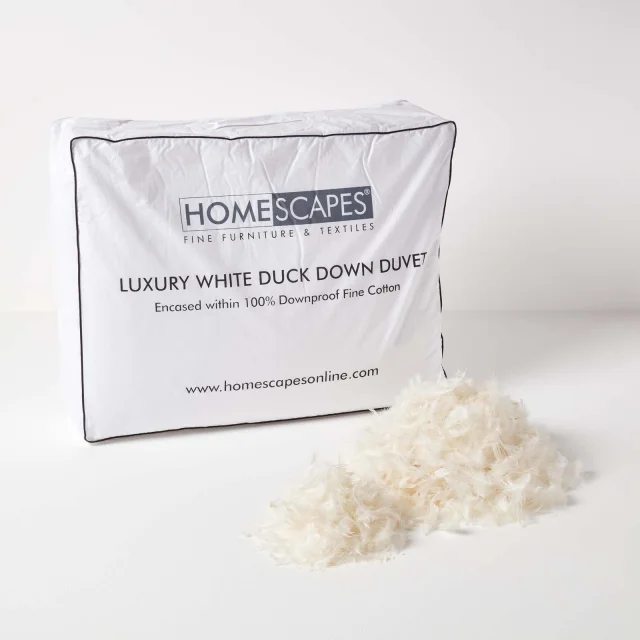 Luksuzna bela odeja iz račjega puha podjetja Homescapes je izbira vrhunske kakovosti, saj račji puh velja za razkošje, kakovost in udobje. Vsako uporabljeno puhovo perje ima certifikat RESPONSIBLE DOWN STANDARD, kar pomeni, da je vse perje pridobljeno na etičen način ter testirano glede sledljivosti in kakovosti. Za zagotovitev, da puhovo perje ostane na svojem mestu, so odeje Homescapes oblečene v 100-odstotni bombaž, odporen na puh. Ta naravna tkanina je zračna in vam bo pomagala ohranjati hladno noč, poleg tega pa je odeja proti pršicam in hipoalergena. S pregradno konstrukcijo škatle boste zagotovo ohranili konstantno temperaturo vso noč brez hladnih točk. Konstrukcija baffle box omogoča pretok zraka po celotnem ležišču, zaradi česar boste vso noč hladni in udobni. Z oceno 4,5 Tog je ta odeja idealna za poletno vreme, saj je lahka in vam zagotavlja plast toplote, ne da bi se pregreli Ta odeja Homescapes je opremljena s plastičnimi zapirali, ki omogočajo združevanje dveh odej Luxury White Duck Duvets za višjo oceno Tog.