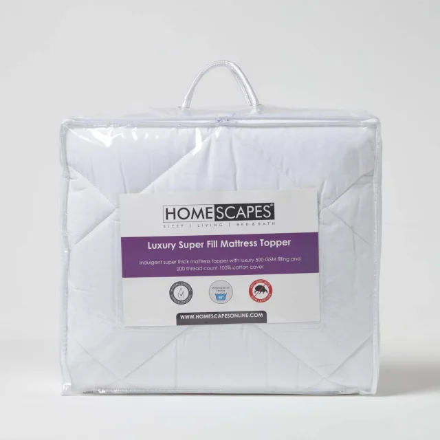 Razvajajoč naddatek za vzmetnico, izjemno debel, z bogatim polnilom 500 GSM, bo dodal dodatno plast podpore in blaženja vaši vzmetnici, ko zdrdrali v spanec v oblaku podobnem udobju. Vsebuje se v super mehki prevleki iz 100% bombaža s 200 nitmi, je ta vrhunski naddatek za vzmetnico drugačen od vseh drugih, je ultimativna luksuzna izbira, ki bo preoblikovala vaš spanec. Gre za hipoalergen naddatek za vzmetnico, ki je primeren za vse, tudi za tiste z alergijami. Ta razvajajoči naddatek je napolnjen z mehkim in vzdržljivim polnilom iz polifibrov, ki ne bo spljoščeno in bo ostalo debelo in elastično čez čas. Enostaven za vzdrževanje, Homescapesov super poln naddatek za vzmetnico je enostaven za čiščenje in ga lahko operete doma. Naše posteljno perilo je izdelano z izjemno strokovnostjo in je certificirano s strani OEKO-TEX, pri čemer so vsa vlakna in polnila testirana, da se zagotovi, da ne vsebujejo strupov in kemikalij. Primeren za vzmetnice z veliko globino in dodatno globokimi vzmetnicami, ima ta naddatek štiri debele in močne trakove za vogale, ki ga varno in na mestu ohranjajo med gibanjem v postelji. Izključno zasnovana s strani Homescapes, naša kolekcija naddatkov in zaščit za vzmetnice vključuje vse, kar potrebujete, da zaščitite svojo posteljnino in si zagotovite najboljši spanec. Ponudba vključuje vodoodporne prevleke za vzmetnice iz frotirja, podloge iz flisa in prešite prevleke, ki so na voljo v standardnih, evropskih in otroških dimenzijah, ter prevleke za blazine, ki so na voljo v standardnih, king size in evropskih dimenzijah.