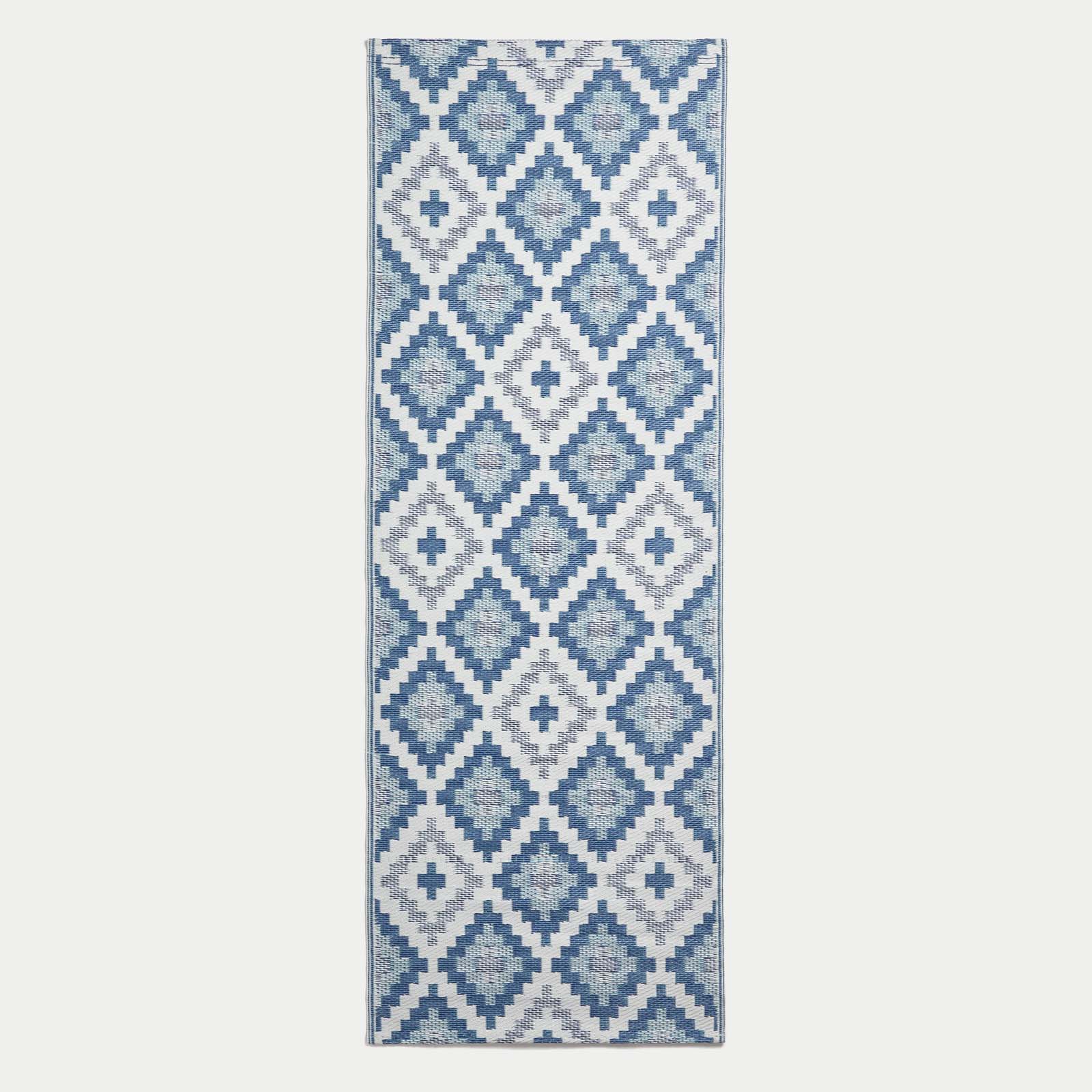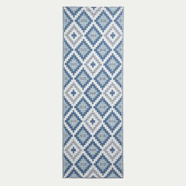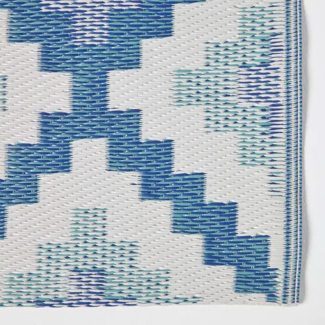S to veliko vrtno preprogo Homescapes dodajte slog svojemu vrtu ali terasi. Ta dekorativna preproga za zunanjo uporabo s presenetljivim modrim geometrijskim vzorcem ima izrazit vzorec, ki pritegne pozornost, in je bila stkana iz 100 % recikliranega polipropilena. Ta velika zunanja preproga je okolju prijazna preproga, izdelana iz odpadne plastike, je lahka in vodoodporna, zato je idealna za vse vremenske razmere in prostore. Idealna je za okrasitev teras, krovov in tlakovanih površin, preproge za uporabo na prostem pa so odlične tudi za piknike, kampiranje ali celo na plaži. Preprosto in enostavno čiščenje: preprosto pometite umazanijo ali nežno operite z blago milnico.