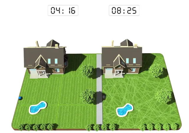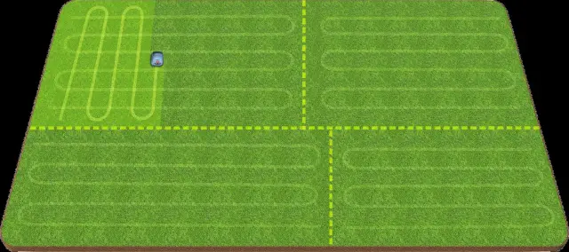 Neomow S uporablja svoj napredni algoritem za izračun najučinkovitejše poti košnje glede na topografijo vaše trate, trato razdeli na več območij in kosi v vzporednih linijah. V primerjavi s tradicionalnimi robotskimi kosilnicami z naključno košnjo, Neomow S zmanjša območja ponavljajoče se košnje in prihrani čas.