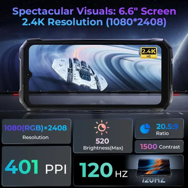 120 Hz osveževalna frekvenca in 6,6-palčni zaslon FHD+】Smartfon za uporabo na prostem je opremljen z velikim 6,6-palčnim zaslonom z ločljivostjo do 1080*2408, ki zagotavlja vrhunsko vizualno izkušnjo pri gledanju videoposnetkov ali igranju iger. Visoka frekvenca osveževanja 120 Hz in svetlost 500 NIT zagotavljata hitro in gladko izkušnjo, tudi pri močni dnevni svetlobi lahko jasno vidite, kaj je na zaslonu.