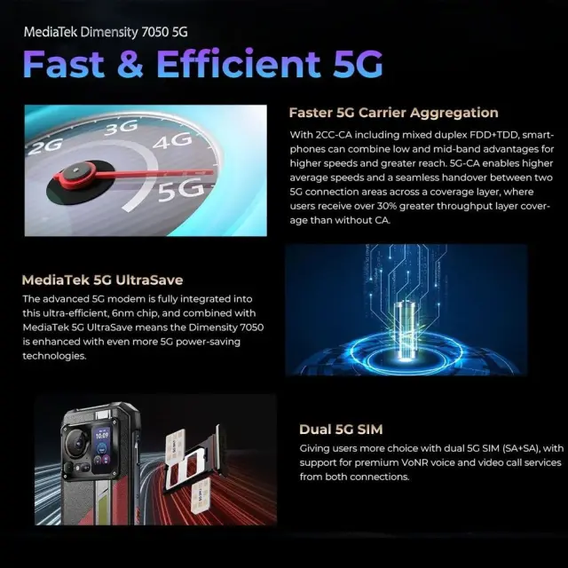 Napredni modem 5G je v celoti integriran v ta izjemno učinkovit 6nm čip, v kombinaciji z MediaTek 5G UltraSave pa pomeni, da je Dimensity 7050 opremljen s še več tehnologijami za varčevanje z energijo 5G.