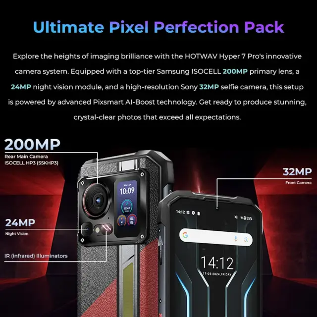 Android 14 & 200M+32MP+24MP kamera za nočni vid】Mobilni telefon Hyper 7 PRO 5G za uporabo na prostem brez vertarge je opremljen z najnovejšim sistemom Android 14, ki celovito ščiti vaše občutljive podatke ter povečuje splošno zmogljivost in življenjsko dobo baterije. Glavna kamera s 64 MP posname vrhunske fotografije in videoposnetke. Kamera za nočni vid 24 MP omogoča jasne posnetke tudi v popolni temi.