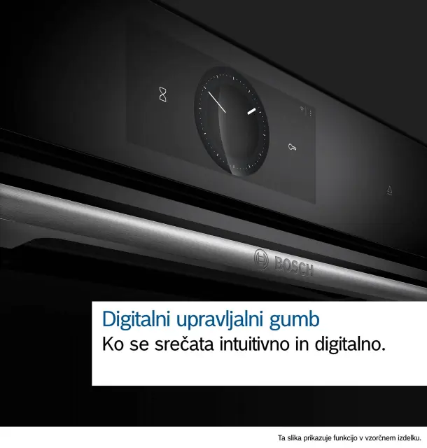 Z inovativnim digitalnim upravljalnim gumbom je kuhanje preprostejše kot kdajkoli. Z enostavnim zasukom osrednjega obroča lahko hitro in preprosto prilagodite vse nastavitve. Pri tem vam je v podporo celopovršinski TFT zaslon na dotik z visoko ločljivostjo ter besedilnim prikazom in neposredno izbiro tipk. Jasni simboli ter informativna sporočila na in v upravljalnem gumbu vam pomagajo med pomikanjem po meniju skozi vsak korak posebej. Zato imate vedno popoln pregled in popoln nadzor nad pečico.