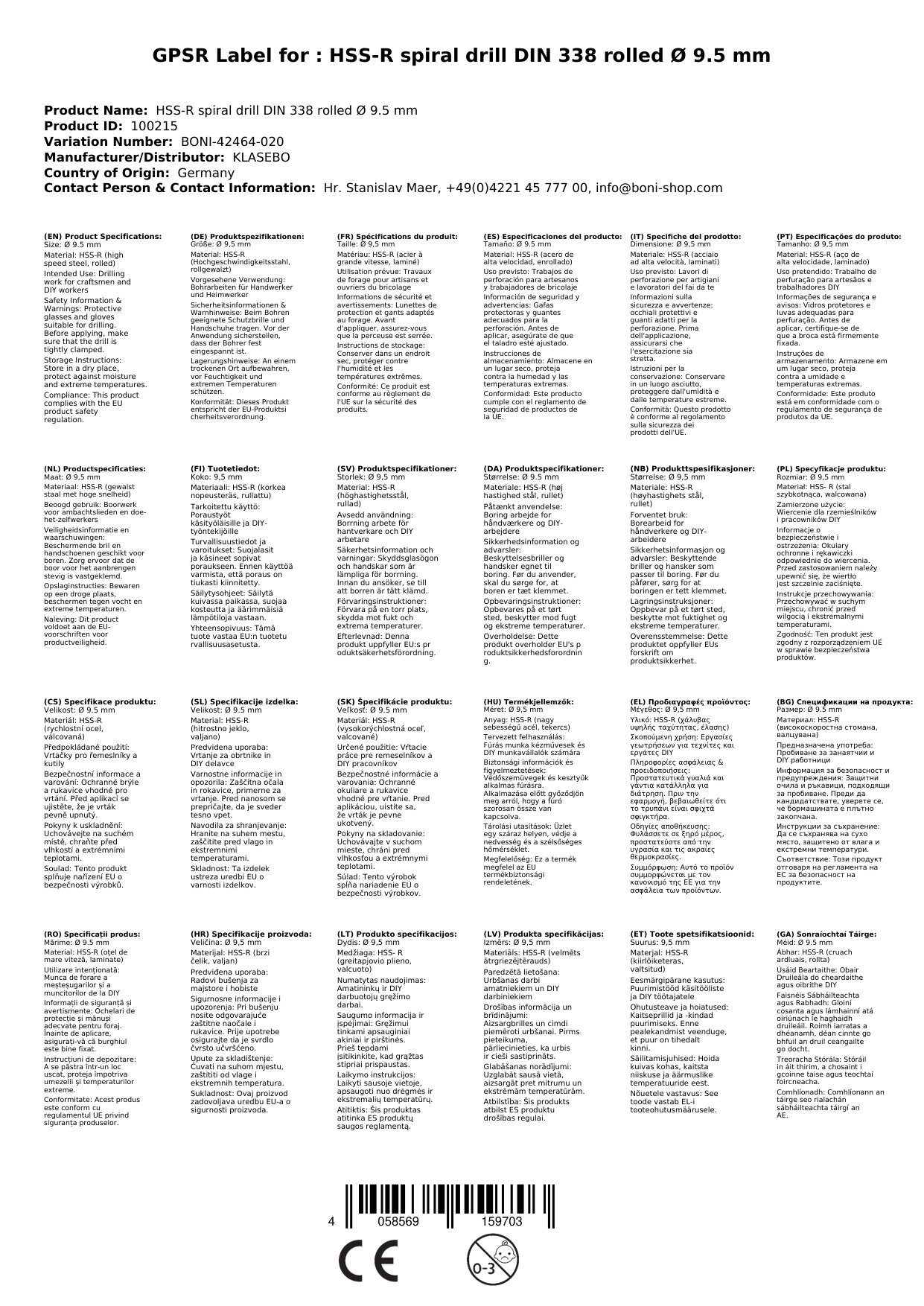 Tehnične specifikacije vključujejo material HSS-R, premer 9,5 mm, skladnost s standardom DIN 338, valjano izdelavo in cilindrično gred. Ta sveder je primeren za legirana in nelegirana jekla, jeklene litine, sintrane kovine, neželezne kovine in celo plastiko, kar ga naredi vsestranskega partnerja v delavnici.