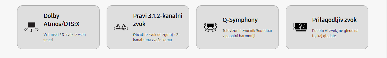 * Dolby Atmos in DTS:X velja za zvočnike Soundbar 2022 Q-serije. * Potrebna je izvirna vsebina Dolby Atmos in DTS:X.