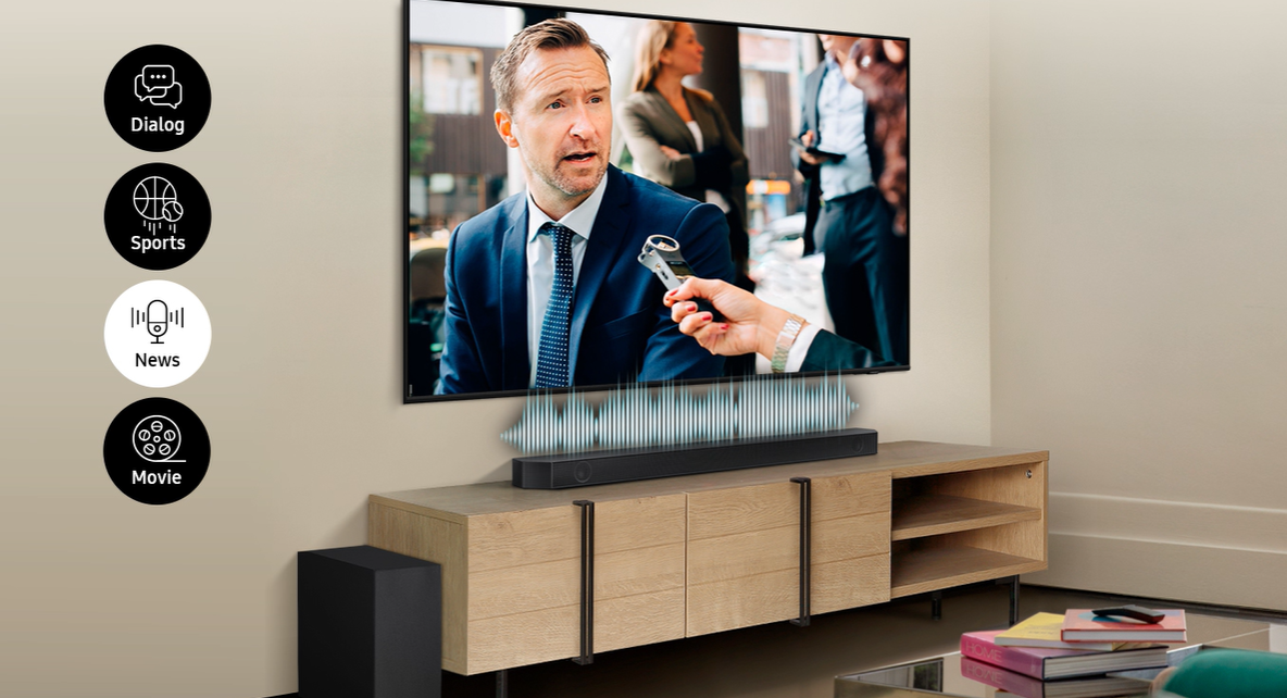 Zvočnik Samsung Soundbar analizira zvočni signal in za vsak prizor posebej samodejno predvaja optimiziran zvok. Zaradi prilagodljivega zvoka lahko jasno slišite glasove tudi pri nizki glasnosti, tako da lahko slišite tudi tišje pogovore.