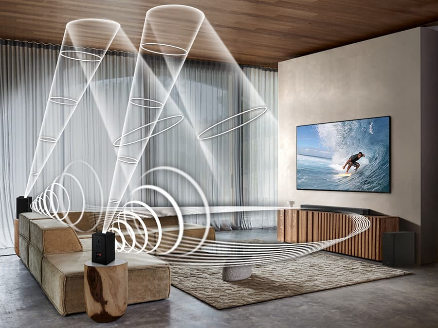 Naj zvok, ki ga poslušate, ne bo nepremičen. Samsung Acoustic Beam tehnologija zagotavlja prostorski zvok za izkušnjo zmogljivega zvoka. Idealno za ogled filmov in igranje iger, kjer se vas bo 3.1.2-kanalni zvok res dotaknil.