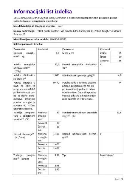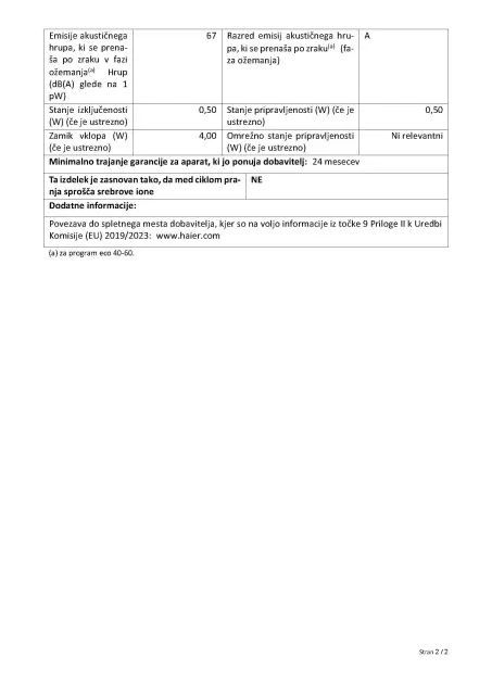 · Poraba el. energije/100 ciklov: 47 kWh
