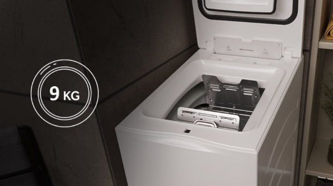 Pralni stroj z zgornjim polnjenjem postavlja nove standarde s svojo impresivno zmogljivostjo pranja perila do kar 9 kg. Njegov prostoren boben in vsestranskost omogočata popolno rešitev za vse vrste perila.