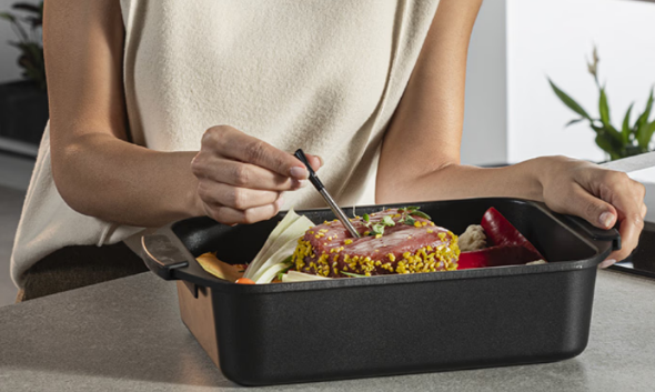Brezžična sonda za meso vam omogoča natančno spremljanje notranje temperature jedi za popoln končni rezultat. Posebej je primerna za ribe in meso.
