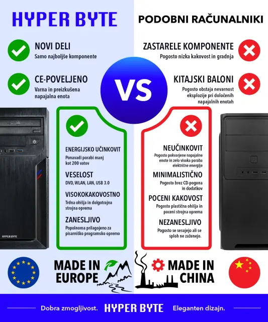 Blagovna znamka Hyper Byte ponuja Office PC-je za hitro in fleksibilno obdelavo v multimedijskem področju ter pri pisarniških nalogah. Hyper Byte Office PC navdušuje z izjemno zmogljivostjo za pisarniške. Takoj pripravljen za uporabo!