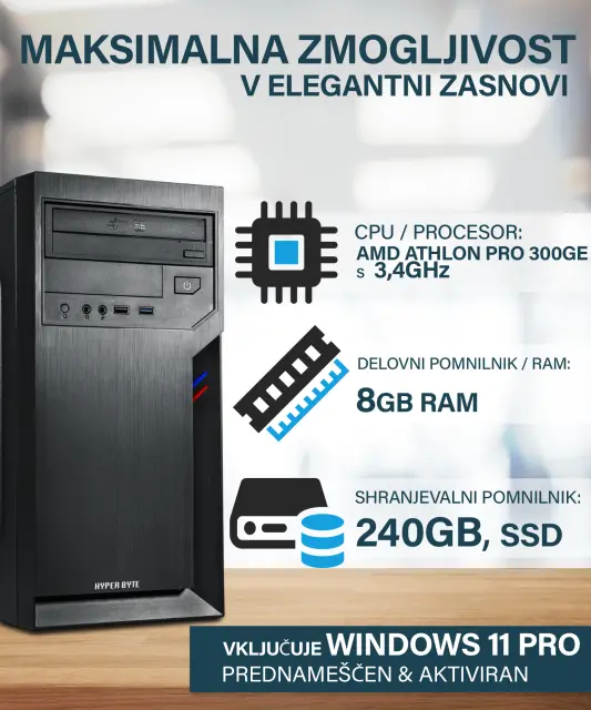 Namizni računalnik HYPER BYTE PC, AMD Athlon PRO, 3,4 GHz, 8GB RAM, 240GB SSD trdi disk,WLAN, DVD+RW, USB 3.0, Win11 Pro | Pisarniški