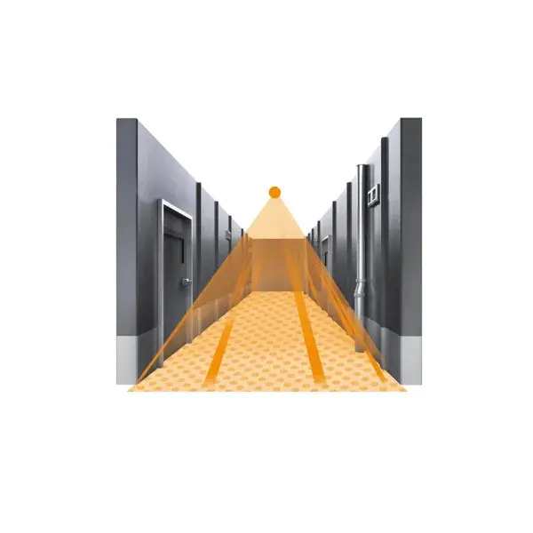 Prostori, kot so prehodi in dolgi hodniki, postavljajo posebne zahteve glede delovanja senzorja. Območje zaznavanja senzorja mora biti ozko, a dolgo. Le tako lahko čim manjše število senzorjev pokrije čim daljše odseke. Znova in znova preizkušen in preizkušen je IS 345 specialist za uporabo v zaprtih prostorih te vrste. Zasnovan je posebej za zaznavanje na hodnikih in ima kot odpiranja 45°. To pomeni, da lahko tangencialno spremlja območje do 23 x 6 metrov.