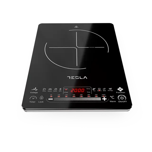 Prenosna indukcijska kuhalna plošča Tesla IC400B z močjo 2000W in digitalnim zaslonom je izjemno priročna in enostavna za uporabo. Ima 8 stopenj nastavitve jakosti kuhanja s katerimi določite, kako hitro želite doseči želeno temperaturo, ter 8 nastavitev temperature v območu med 80°C in 240°C. Poleg manualnih nastavitve ima kar 8 prednastavljenih programov, ki vam olajšajo in pohitrijo izbor želene temperature, glede na jed/pijačo, ki jo pripravljate. Funkcija 4-urnega digitalnega časovnika, vam omogoča popoln nadzor nad dolžino kuhanja, ponaša pa se tudi s funkcijo 24-urnega zamika vklopa. Plošča ima vgrajeno dodatno zaščito pred pregrevanjem in previsoko napetostjo, ter se samodejno izklopi po 1 minuti, v kolikor na kuhalniku ni posode. Za dodatno varnost poskrbi funkcija zaklepanja. Velikost plošče je 250 x 250 mm. Dolžina napajalnega kabla: 1,3 m. Odlikuje jo tanek in eleganten dizajn, ter upravljanje na dotik z drsnikom, kar omogoča hitrejše nastavljanje in enostavno čiščenje. Zaradi izjemne učinkovitosti prihrani tako čas, kot energijo.