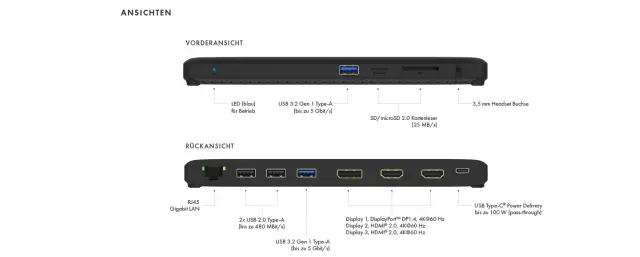 Ta priključna postaja ponuja številne priključke, kar omogoča večjo funkcionalnost in prilagodljivost vašemu delovnemu okolju. Vključuje: