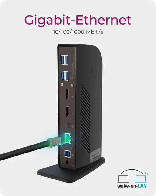 Povezava je preprosta in se izvede z USB 3.0. Po povezavi je na voljo vseh dodatnih enajst vrat (6x USB 3.0, Gigabit LAN, 2x DisplayPort™, slušalke in mikrofon).