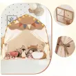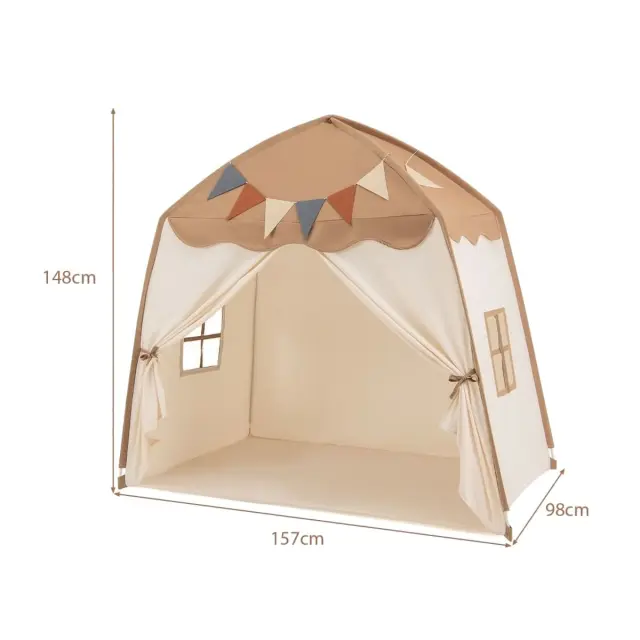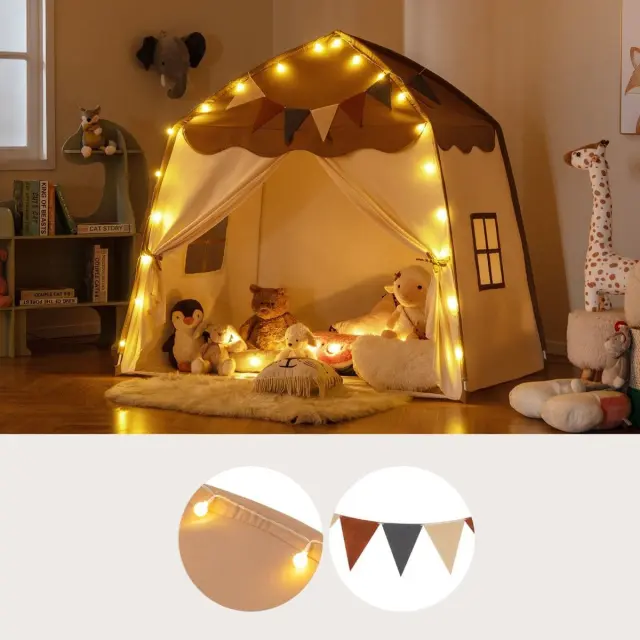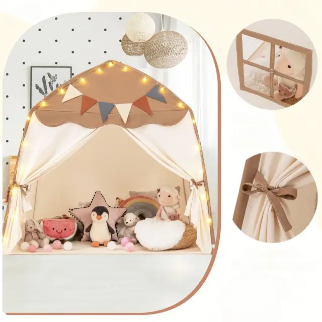 Prikupna zasnova: Z boho zavesami na vratih, prikupnimi okni in očarljivim dodatkom toplih belih pravljičnih luči in pisanih zastavic je šotor za igro očarljivo skrivališče za dan in noč, ki vabi k neskončni domišljijski igri in zabavnim nočnim zabavam.