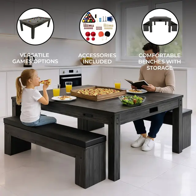 Ta pametno zasnovana miza se brez težav preklaplja med biljardom, namiznim tenisom, zračnim hokejem, šahom, backgammonom, shuffleboardom in polno jedilno mizo, zaradi česar je resnično vsestranska za vsako okolje. Ročni zapisnikarji, vgrajen predal za biljardne krogle in namensko držalo za dve biljardni palici zagotavljajo, da je vse organizirano in pripravljeno za igro. Funkcija zračnega hokeja deluje prek električnega omrežja in zagotavlja hitro zabavo, kadar koli želite dvigniti energijo.