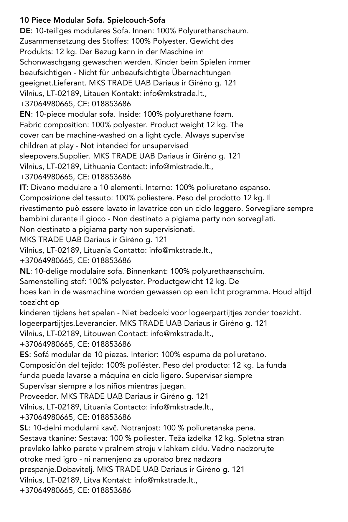 10-delna zasnova: 10-delni igralni kavč je sestavljen iz dveh polkrožnih naslonjal, dveh naslonjal, dveh naslonjal za roke in štirih sedežnih blazin. To je vse, kar potrebujete za izdelavo podloge za dejavnosti, dveh stolov, šotorskega gradu ali odličnega kavča. Igralne kavče lahko kombinirate za dvojno ali trojno zabavo.