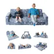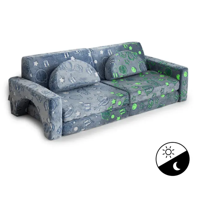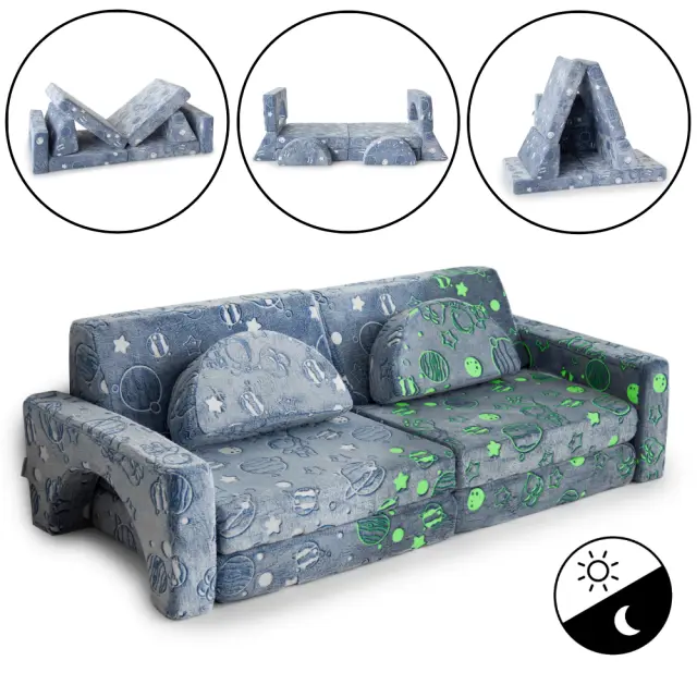 10-delna zasnova: 10-delni igralni kavč je sestavljen iz dveh polkrožnih naslonjal, dveh naslonjal, dveh naslonjal za roke in štirih sedežnih blazin. To je vse, kar potrebujete za izdelavo podloge za dejavnosti, dveh stolov, šotorskega gradu ali odličnega kavča. Igralne kavče lahko kombinirate za dvojno ali trojno zabavo.