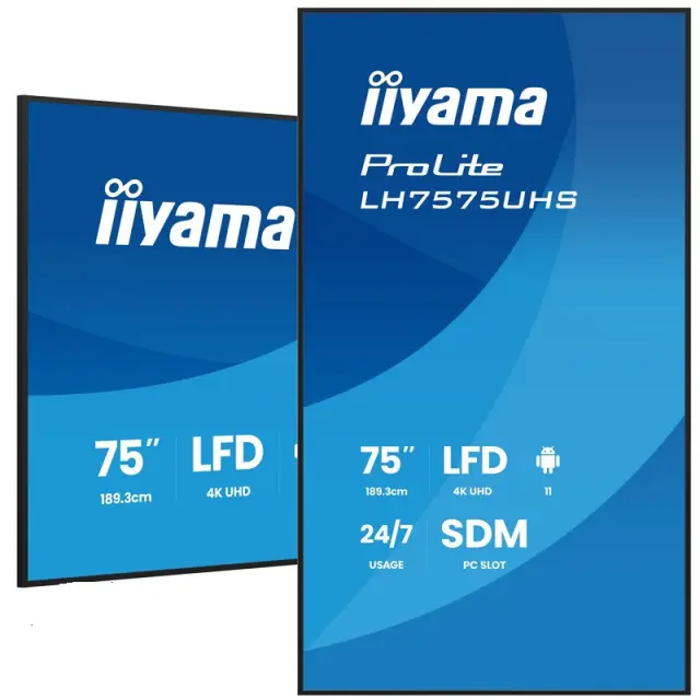 Izberite neprekinjeno visoko zmogljivost in zanesljivost z idealno vse-v-enem rešitvijo za digitalno označevanje v kritičnih okoljih. LH7575UHS-B2AG podjetja iiyama omogoča delovanje v ležeči ali pokončni orientaciji v neprekinjenem 24/7 okolju brez prekinitev. Njegova vsestranskost se lahko prilagodi potrebam vaše industrije. Vgrajeni Android 11 OS pomeni, da lahko zaslon enostavno prilagodite svojim potrebam in nanj neposredno namešč ate aplikacije. Vgrajeni iiSignage (sistem za upravljanje vsebin) vam omogoča popoln nadzor nad vašim sporočanjem in oglaševanjem - oddaljeno in varno.