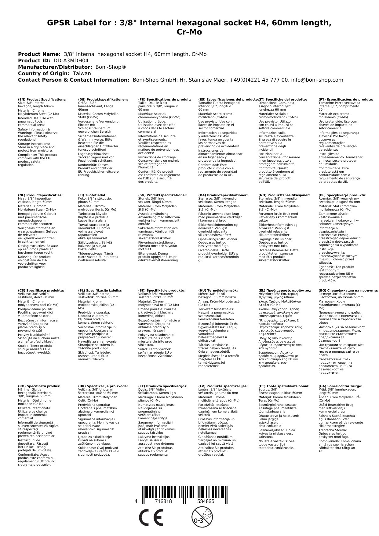 Visokokakovostni imbus nasadni ključ 3/8 H4, dolg 60mm, je zasnovan za zahtevno uporabo v industriji in domačih delavnicah. Izdelan iz vrhunskega krom-molibden jekla (Cr-Mo), zagotavlja dolgo življenjsko dobo in odpornost proti obrabi, tudi pri intenzivni uporabi. Ključ je primeren za udarne vijačnike in nudi možnost izbire med različnimi priključki (3/8", 1/2" in 3/4"), kar povečuje njegovo vsestranskost in omogoča uporabo v različnih aplikacijah.