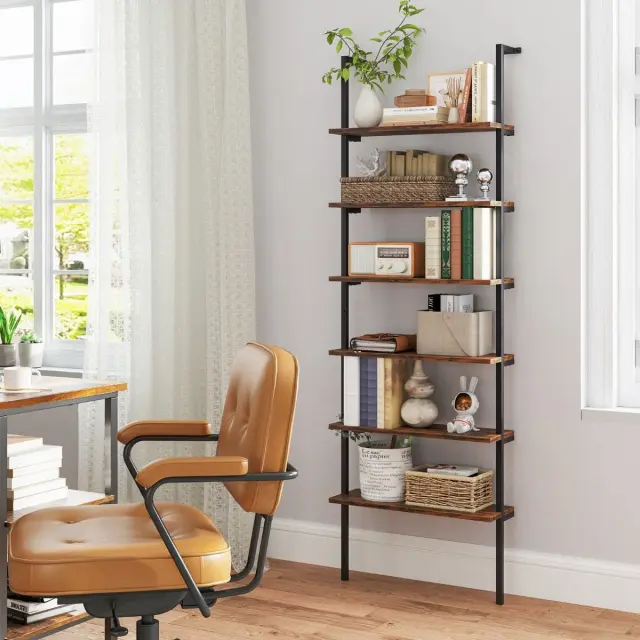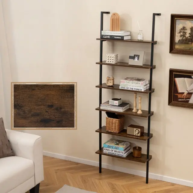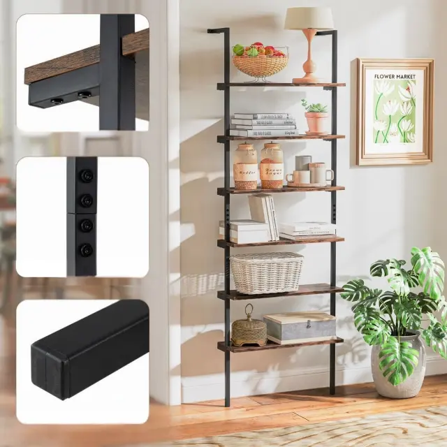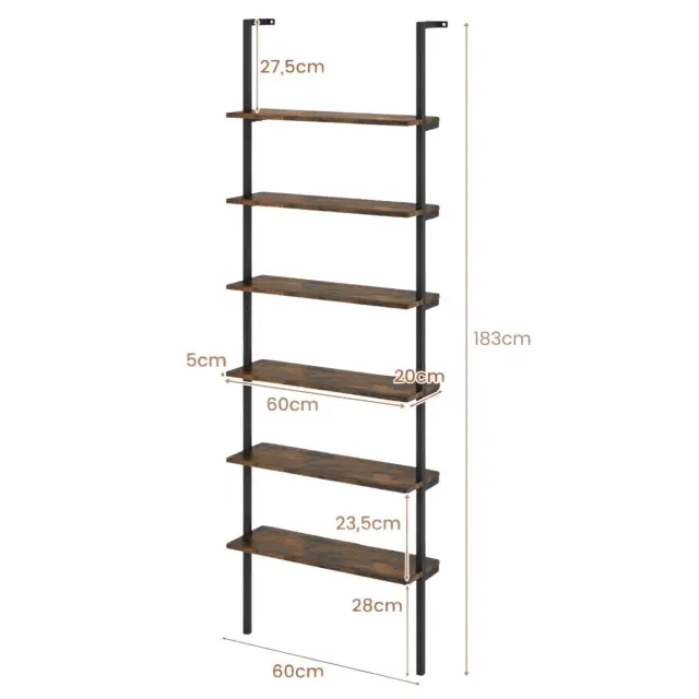 Knjižnica v obliki lestve ima 6 odprtih ravni polic in zagotavlja dovolj prostora za shranjevanje različnih predmetov. Ta stenska polica, izdelana iz odebeljenih desk in robustnega kovinskega okvirja, lahko vzdrži do 20 kg na raven in zagotavlja zanesljivo površino za razstavljanje dragocenih predmetov. Njena industrijska zasnova se brezhibno zlije s katerim koli okoljem, bodisi kot elegantna knjižna polica v pisarni, privlačen razstavni element v dnevni sobi, lepo stojalo za rastline na balkonu ali praktična rešitev za shranjevanje v kuhinji.