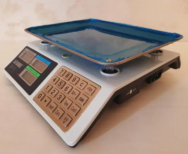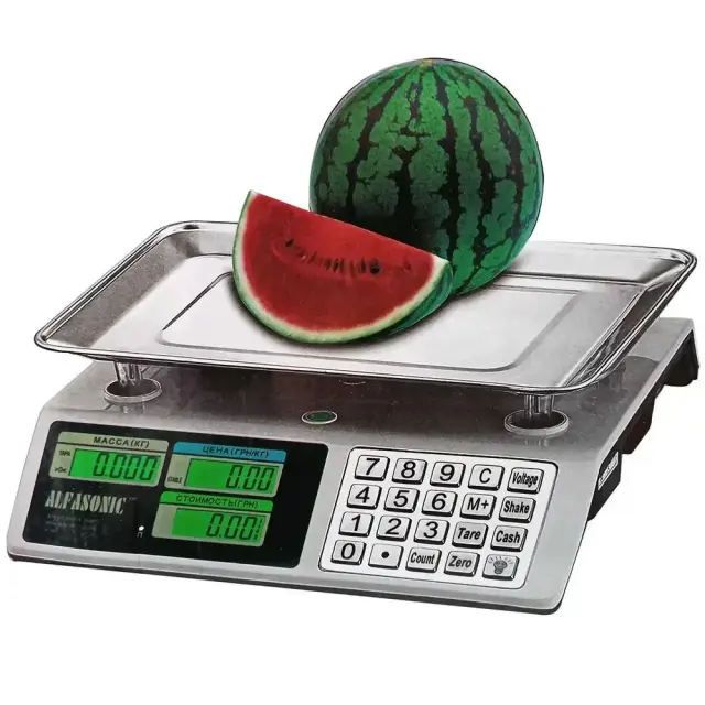 Trgovinska tehtnica je odlična rešitev in odlična izbira za vse, ki delate v maloprodaji in potrebujete natančnost tehtanja. S temi lestvicami je enostavno in preprosto delati, napisi na gumbih so jasno vidni. Tehtnica je zelo natančna, korak tehtanja je le 2 grama. Obstaja funkcija tare. Povzamete lahko več izdelkov z različnimi cenami in različnimi utežmi. Tehtnice delujejo iz omrežja in akumulatorja. Na strani kupca in prodajalca so trije zasloni, na katerih so prikazani vsi podatki o artiklu, ki se tehta: skupna cena, cena, teža.