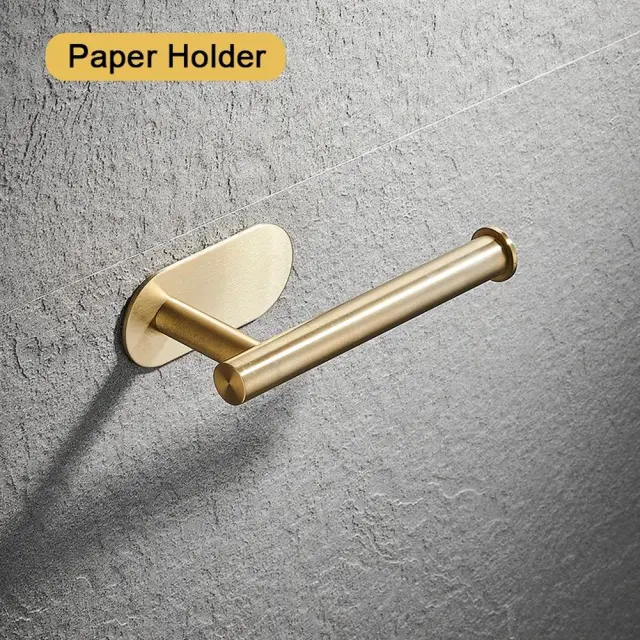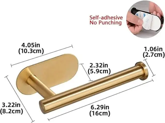 Zlato samolepilno držalo za toaletni papir. Izdelan iz trdnega nerjavečega jekla z rahlo zaobljenimi oblikami. Priročna, neinvazivna namestitev z močnim dvostranskim trakom 3M.