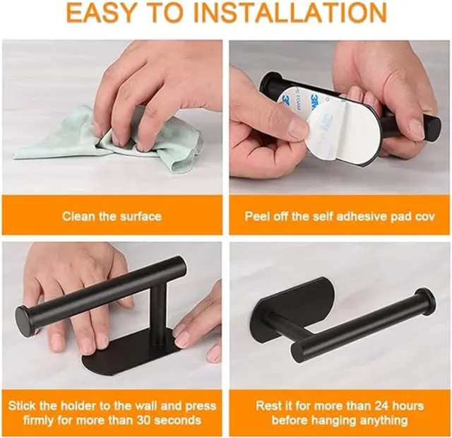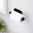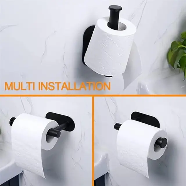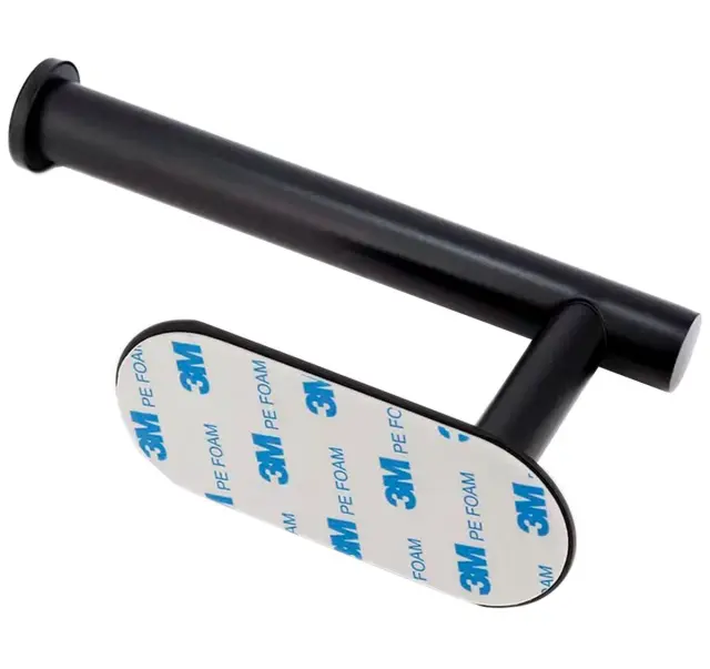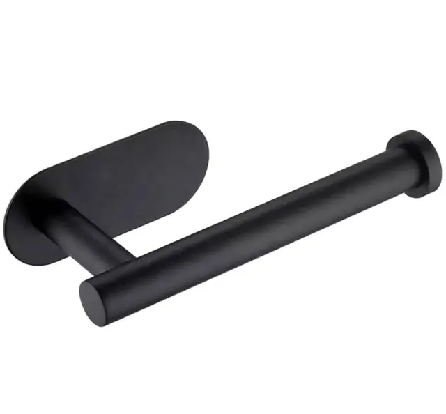 Črno samolepilno držalo za toaletni papir. Izdelan iz trdnega nerjavečega jekla z rahlo zaobljenimi oblikami. Priročna, neinvazivna namestitev z močnim dvostranskim trakom 3M.